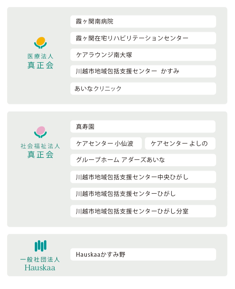 医療法人真正会は、設立理念を「老人にも明日がある」とし、「医療は福祉が原点である」「地域なくして医療は成り立たない」というビジョンを持っています。