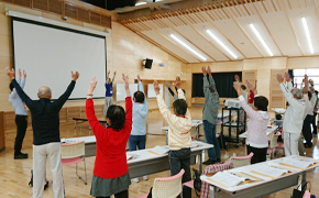 介護が必要になる原因の、加齢による虚弱、転倒、認知症、脳血管疾患等を予防する⽅法を、講義や実技を交えて学ぶ教室を、⾃治会館等で開催しています。また、住⺠主体の自主グループ等を続けられるよう支援もしています。元気なうちから身体づくり!がキーワードです。